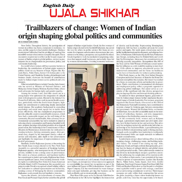 Indian-origin women are breaking barriers in global politics, blending cultural heritage with visionary leadership to inspire change. From Kamala Harris and Jenifer Rajkumar in the U.S. to Pam Gosal in Scotland and Preet Kaur Gill in the U.K., their contributions span governance, human rights, sustainability, and community empowerment. Their stories exemplify the transformative power of representation, proving that diversity in leadership is essential for shaping inclusive and equitable societies